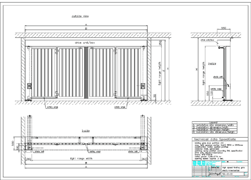 Die gesamte lichte Bauöffnung wird vom SpeedGate freigegeben. Die selbsttragende Rahmenkonstruktion trägt die komplette Antriebseinheit, bestehend aus Motor mit angeflanschtem, selbsthemmenden Schneckenradgetriebe sowie Kraftübersetzungen auf die Torflügel und Torlagerungen. An der Unterseite der eingehausten Antriebseinheit ist eine Revisionsklappe angeordnet. Diese kann zu Wartungszwecken und zur Notbetätigung der Toranlage bei Stromausfall geöffnet werden. Die Revisionsklappe ist durch einen Microschalter abgesichert, so dass ein elektrischer Betrieb der Anlage bei geöffneter Revisionsklappe nicht möglich ist. Der Antriebskasten weist eine Bauhöhe von lediglich 250 mm auf und ermöglicht damit den Einbau der Toranlage auch bei beengten Platzverhältnissen. Das SpeedGate verfügt weder über Bodenschiene, die den ein- und ausfahrenden Verkehr der Parkzonen behindern könnte, noch stehen nach dem Einbau Wartungen zur Reinigung und Pflege / Reparatur einer Schiene an. Eine Beheizung dieser zur Absicherung im Winterbetrieb gegen Einfrieren entfällt, da nicht vorhanden. Zusätzliche Kosten für jedwede Bodenarbeiten entfallen, die mit dem Aushub des Bodens und dem Verguss die Schienen anfangen und mit Installationen und Nacharbeiten enden.