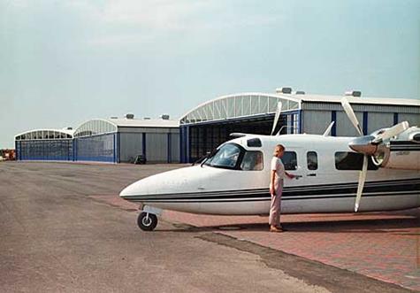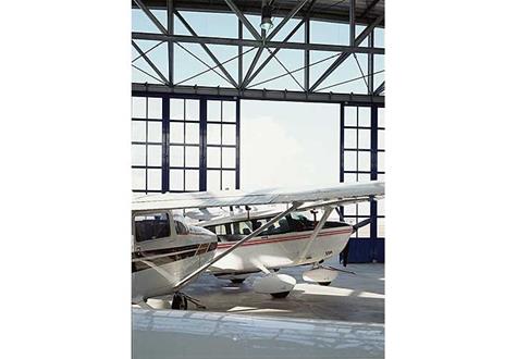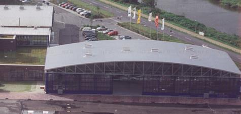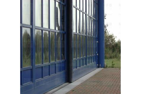 Vollflächig verglaste Teleskop-Schiebetore in Hangartor-Ausführung mit den Maßen 50 x 5,6 m bzw. 30 x 5,6 m als Gebäudeabschluss für eine Hangar-Werfthalle.